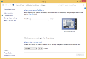 アイコンとテキストを大きくするには、オペレーティングシステム全体でアイコンとテキストを拡大する必要があります。これを行うには、デスクトップを右クリックして、[画面の解像度]を選択する必要があります。次のウィンドウで、[テキストやその他のアイテムを拡大または縮小する]オプションを選択し、目的のサイズ(パーセンテージ)を選択します。設定はログアウト後に有効になります。これらの変更を行っている間は、Archicadが実行されていないことを確認してください。これらの設定を適用してもアイコンやテキストが小さすぎる場合は、画面の解像度を低く設定する必要があります。