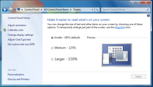 アイコンとテキストを大きくするには、オペレーティングシステム全体でアイコンとテキストを拡大する必要があります。これを行うには、デスクトップを右クリックして、[画面の解像度]を選択する必要があります。次のウィンドウで、[テキストやその他のアイテムを大きくしたり小さくしたりする]オプションを選択し、スライダーを使用して目的のサイズを選択します。設定はログアウト後に有効になります。これらの変更を行っている間は、Archicadが実行されていないことを確認してください。これらの設定を適用してもアイコンやテキストが小さすぎる場合は、画面の解像度を低く設定する必要があります。