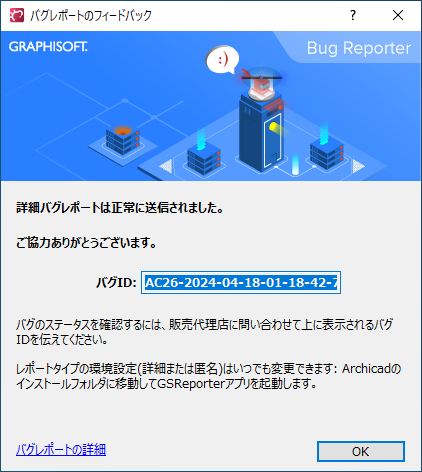 [レポートを送信]ボタンをクリックすると、バグレポートはGraphisoftサーバーとのインターネット接続を確立しようとします。接続が成功すると、レポートが送信されます。詳細なクラッシュレポートを送信すると、バグIDが表示されます。接続に失敗した場合、レポートファイルをとして保存されます。お使いのコンピュータにREPファイルを保存し、お近くのサポートまでお送りください。
