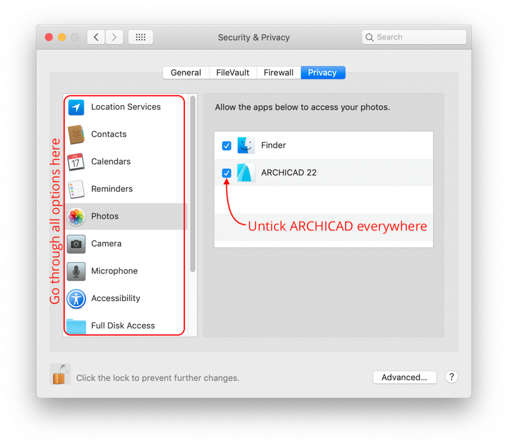 ’システム環境設定 > セキュリティとプライバシー > プライバシー'に移動し、左側の全てのサブメニュー内にARCHICADオプションのチェックを外すと解決します。また、ARCHICADを最新の状態かどうかを確認ください。