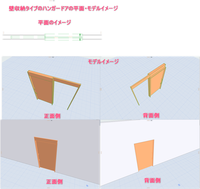 標準のARCHICADライブラリーでは、壁引込への対応として、「引込み戸」が用意されていますが、施設等で主に使用するハンガードアの引き込みドアの場合、両面で画像のように意匠が異なります。