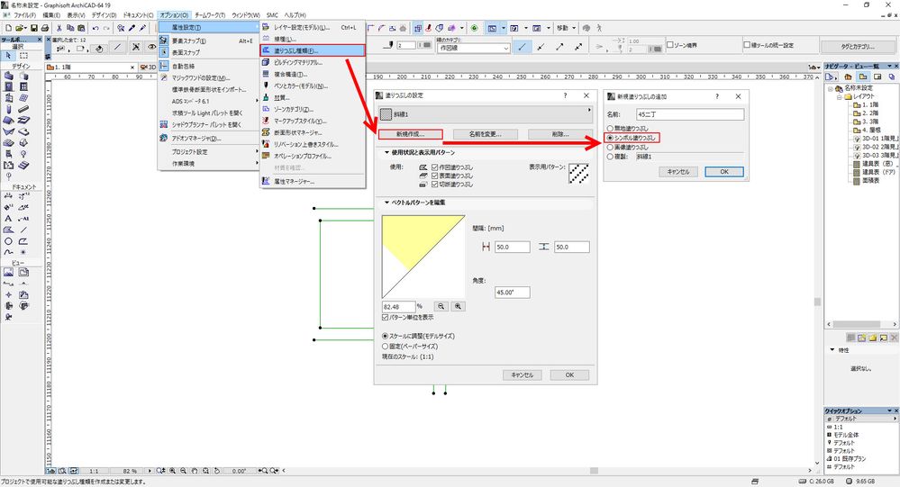 ARCHICADでは単線や塗りつぶし、画像からハッチングのパターンを作成する事ができます。