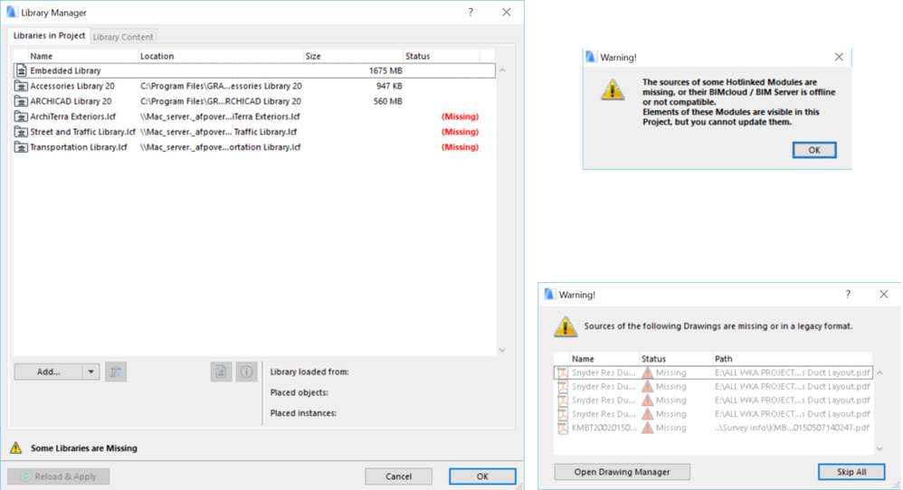 他のコンピュータでArchicadプロジェクトを開いているときに、参照ファイルが見つからないという警告が表示されます。