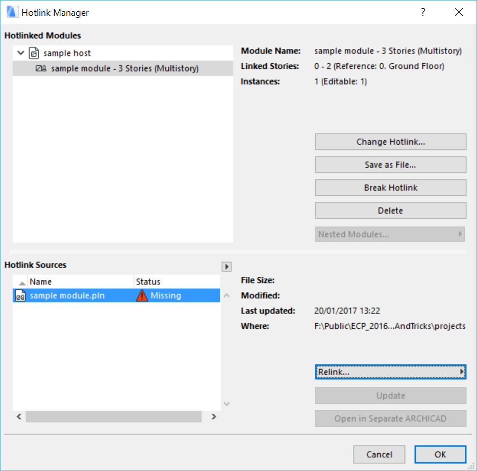 - ホットリンクモジュールは、単なる参照ではなく、実際の要素です。ホットリンクされたモジュールファイルへの接続が失われると、モジュールを更新できなくなります。