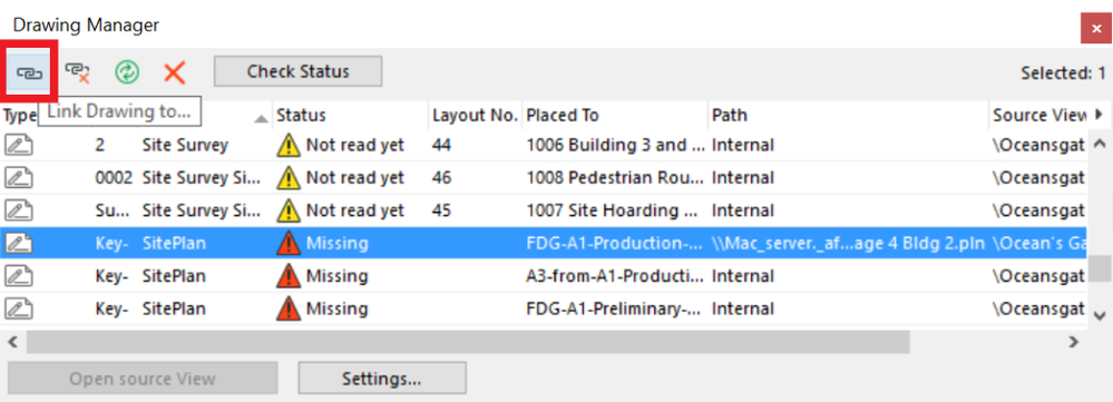- プロジェクトの欠落している図面が新しいコンピューターの同じフォルダにある場合、それらを再リンクするのは非常に簡単です。図面マネージャで不足している図面を選択し、ダイアログの左隅にあるチェーンアイコン(図面のリンク先)をクリックします。ダイアログで複数の項目を選択すると、選択した複数の図面を外部ソースフォルダにリンクできます。