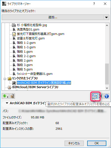 リンクされたライブラリから該当ライブラリを選択し、「選択されたライブラリの配置済みオブジェクトを埋め込む」をクリックします。