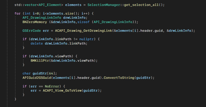 Hello. I have been experimenting with ACAPI_View_GoToView and ACAPI_Drawing_GetDrawingLink functions. My idea was to make the camera to move to an selected element in Archicad environment, however, for some reason, ACAPI_Drawing_GetDrawingLink returns -2130313112 error. Here is the code: