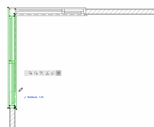 É possível definir larguras diferentes para cada lado da janela de canto. Para isso, clique nos pontos quentes da janela que ficam sobre a linha externa da parede. Quando o ícone de lápis aparecer, você poderá ajustar a largura de cada lado, como mostrado na imagem abaixo.