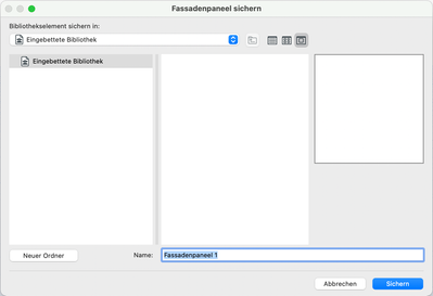 Wählen Sie im Menü den Befehl Ablage> Bibliotheken und Objekte> Auswahl sichern als...> Fassadenpaneel aus. Geben Sie an, zu welcher Ebene das Element parallel sein soll und sichern Sie das Element.