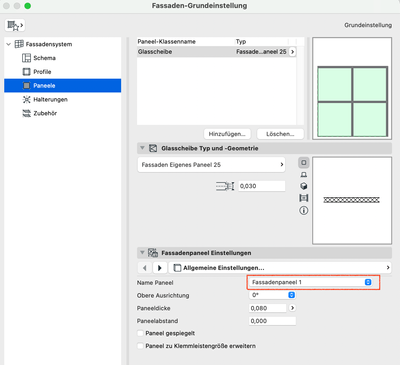 Danach können Sie unter Fassadenpaneel Einstellungen/Name Paneel Ihr neu erstelltes Paneel auswählen. Je nach Positionierung und Modellierung des Paneels muss man es eventuell spiegeln, oder die Paneeldicke erhöhen.