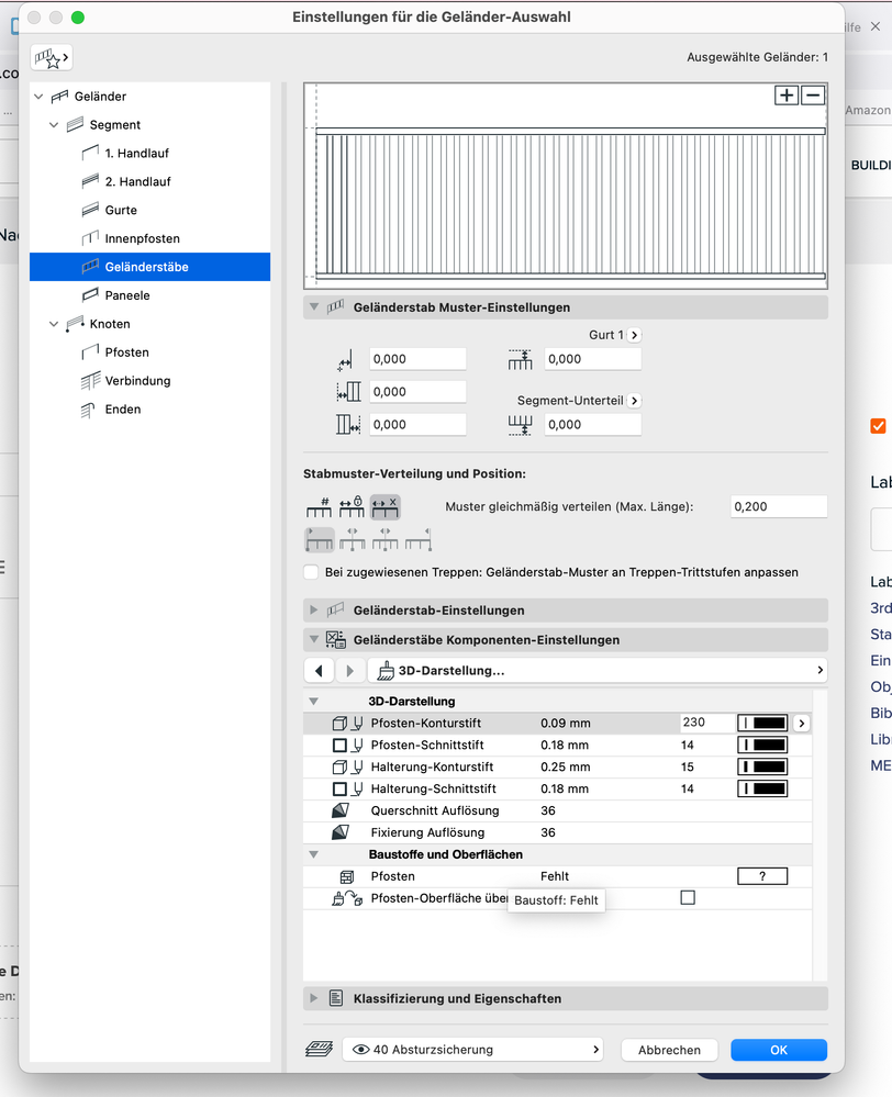 ich vermute, dass es sich nicht um die Geländerstäbe sondern um die Innenpfosten handelt. Hast du dort die Stifteinstellungen ebenfalls kontrolliert?