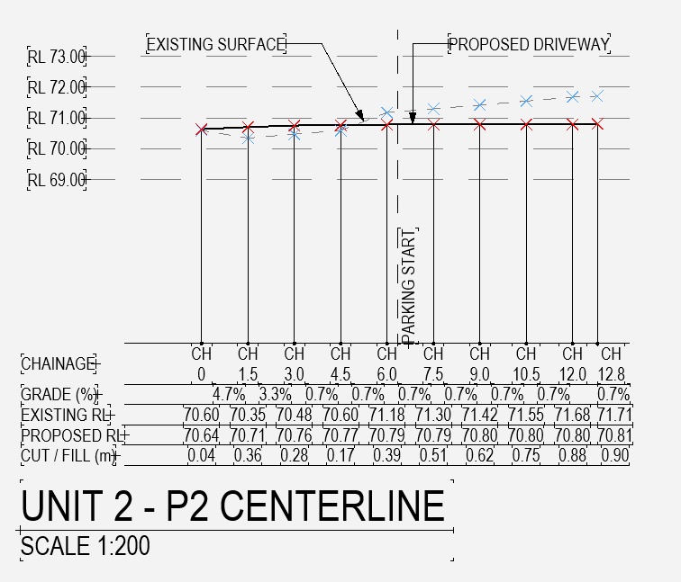 - Is there a way to generate a driveway long section, that would give the RLs of both the existing ground and proposed ground levels, with the proposed driveway gradients (or some of these to minimize my manual input), or