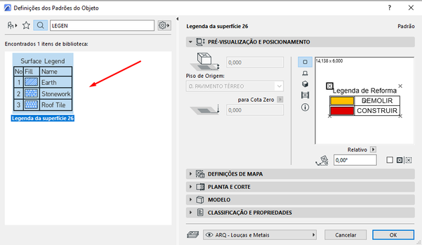 Para chegar nesta legenda, existe um objeto que pode nos ajudar, o "Legenda de Superfície". Nele, podemos alterar algumas características de cada linha para indicar o significado de cada padrão de representação.