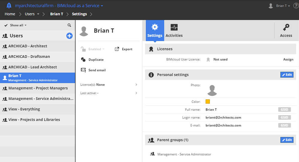 On the Users page, you can export and import your existing users from your previous BIMcloud / BIMcloud Basic to your new BIMcloud Software as a Service.