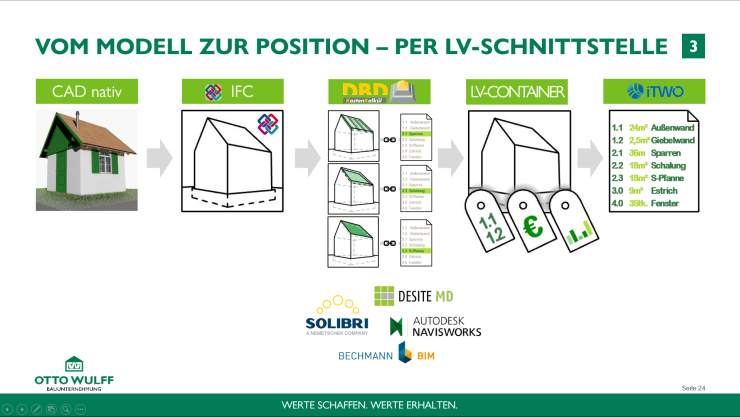 ...und danach auch ein weiteres Format, damit das Modell, verknüpft mit LV-Texten, an iTWO übergeben wird. Da bietet sich LV-Container an. (Den Import haben wir in einem anderen Szenario mit iTWO getestet und das funktioniert auf den ersten Blick.)