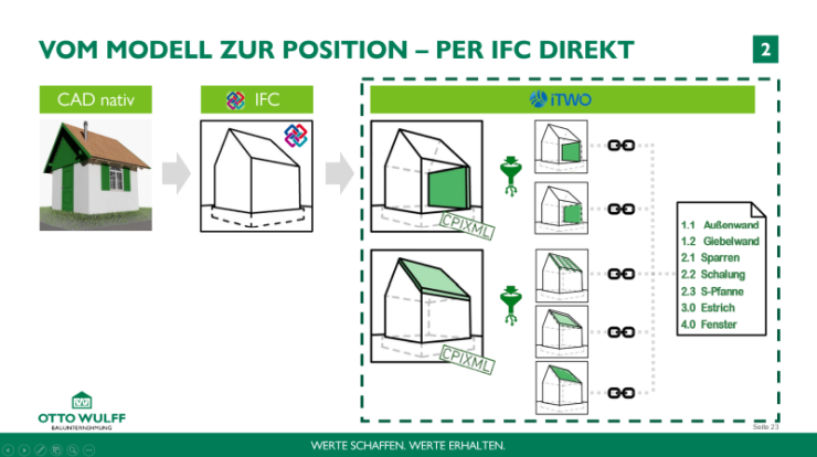So weit ich das jetzt recherchiert habe, kann ich in iTWO IFC importieren. Dabei wird es IMMER in CPIXML konvertiert. Das ist mittelmäßig komfortabel und bietet einige Editiermöglichkeiten, behält dabei aber die Bezüge zum IFC-Modell.