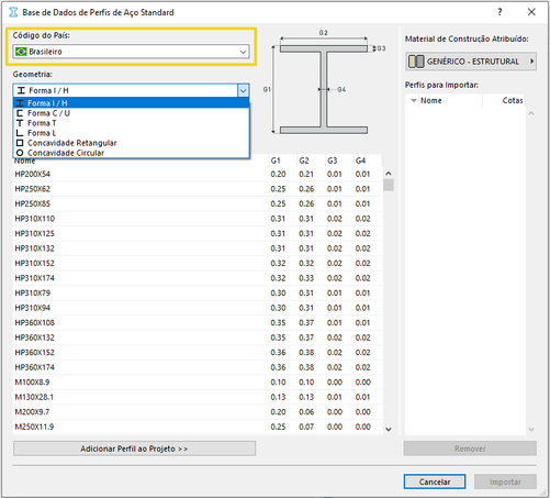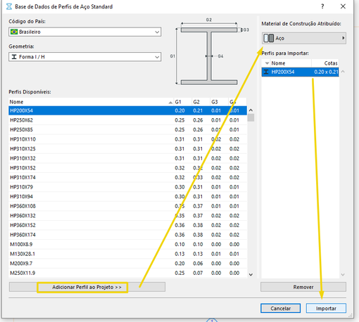 Para adicionar no seu projeto, selecione o perfil desejado e clique em "Adicionar Perfil ao Projeto" e escolha o Material de Construção desejado