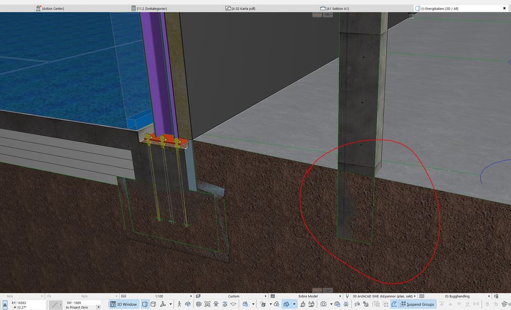 If we stick for example a concrete column in this ground and apply to it the building material concrete with a higher priority than that of the ground, and make a 3D section along the axis of the column, it is clear that the model relief does not work priority of building material and extra ground volume is not subtracted from the volume of concrete.
