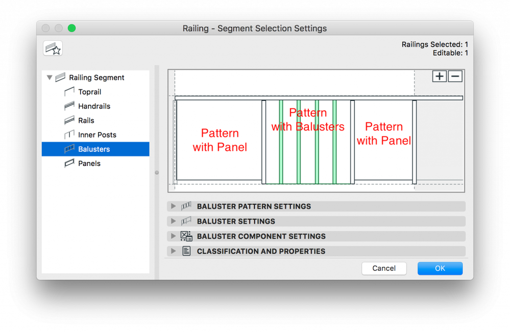 - Select the Segment, its Pattern you want to edit and open the 'Railing - Segment Selection Settings'