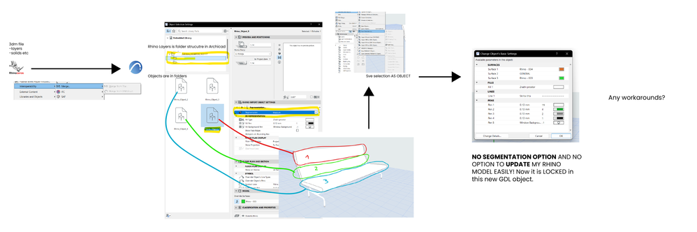 This process works well as my Rhino file is segmented into GDL elements by layer and object, and each solid in Rhino becomes a GDL object in Archicad.The great part is that these imported objects offer an option for morph segmentation, allowing adjustments from high to low poly, which is fantastic for performance tuning. However, I'm facing a challenge with managing a large number of objects—around 50 in my current project. Here are the issues I'm dealing with: