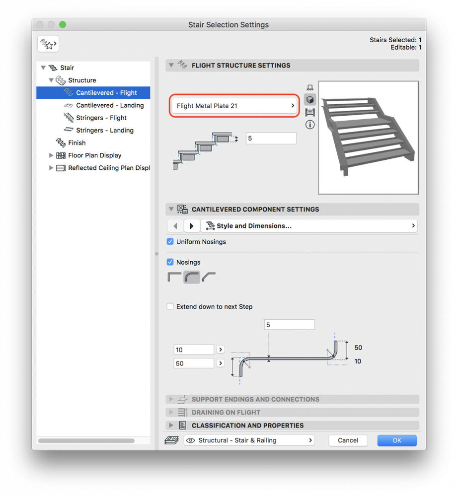 - Apply the same settings to the Stringer of the Landing as well (Note: Connection type settings are not applicable for landings. This option is only available under the flight settings).