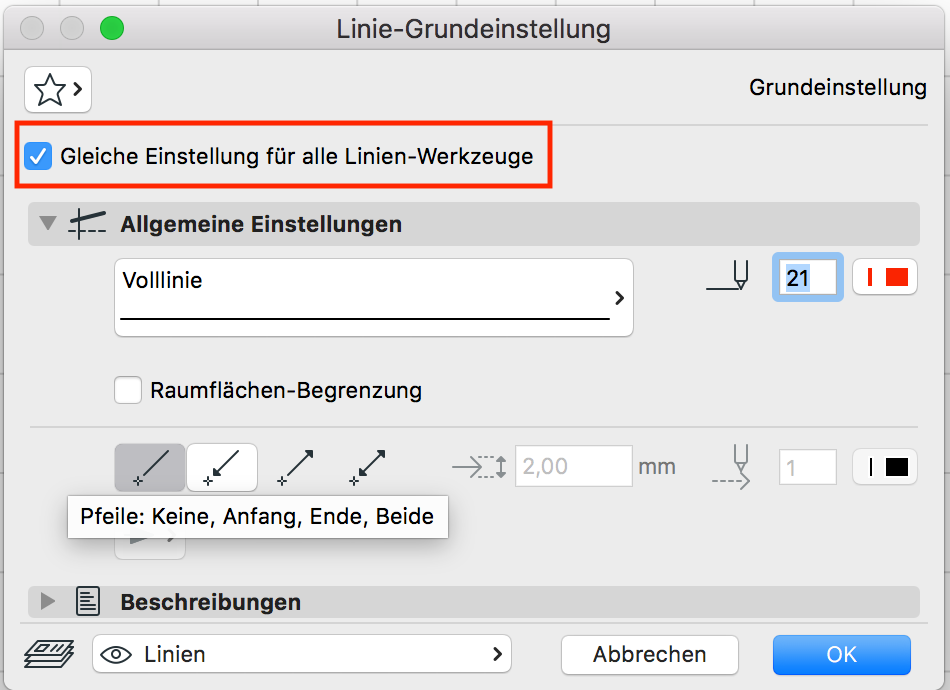 Gleiche Einstellung für alle Linien-Werkzeuge und bestätigen mit