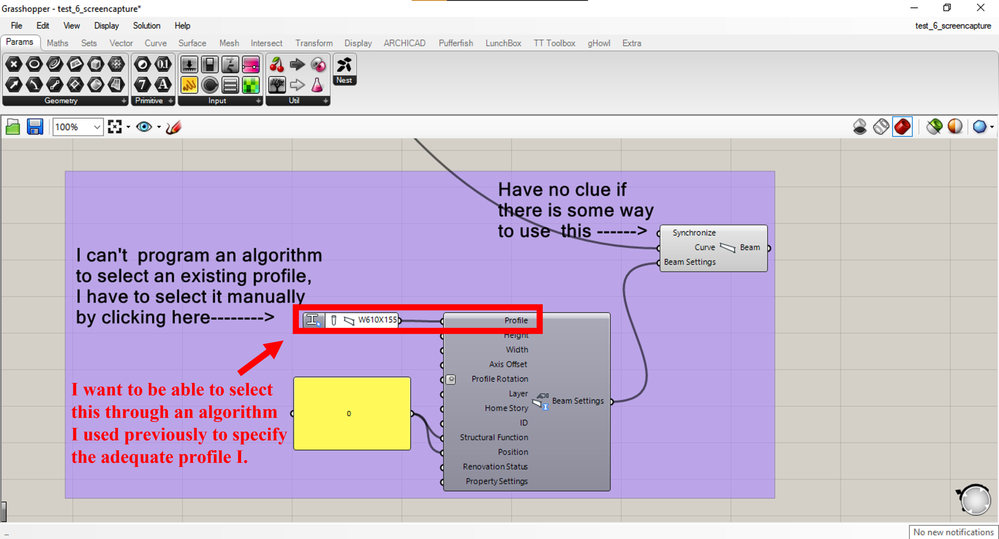 @Lilianmfs I don't use GH, but I will try to help. If you want to select a beam, I would expect that the section of beam is determined by several values e.g. you need a beam section to suit a span / load condition. This process is usually managed in a look up table / database. Is there some way you can create a database in GH populated with the AC profile names that would, based on input values, allow selection of the profile name string? Unfortunately, this will also require the AC beam profiles to remain sync'ed. Have you considered that the best selection isn't always the mathematically perfect selection, sometimes beams are oversized for other reasons e.g. visual or coordination with other components. I may be over thinking what you are trying to do. To simplify down to the basics I would assume the node [Profile] input is programmed to accept a string value which you could type in manually? Is there a way to expose the profile selector output to check? If it is a simple string then you should be able to build from there.