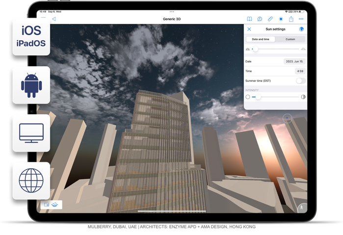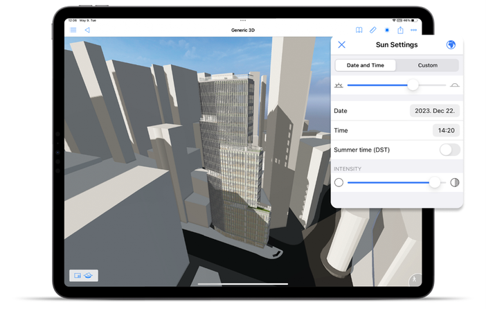 Temos o prazer de anunciar um novo recurso do BIMx para dispositivos móveis que muitos de nossos usuários solicitaram: O posicionamento do sol por data e hora está disponível na paleta de definições do sol nos aplicativos para iOS e Android!