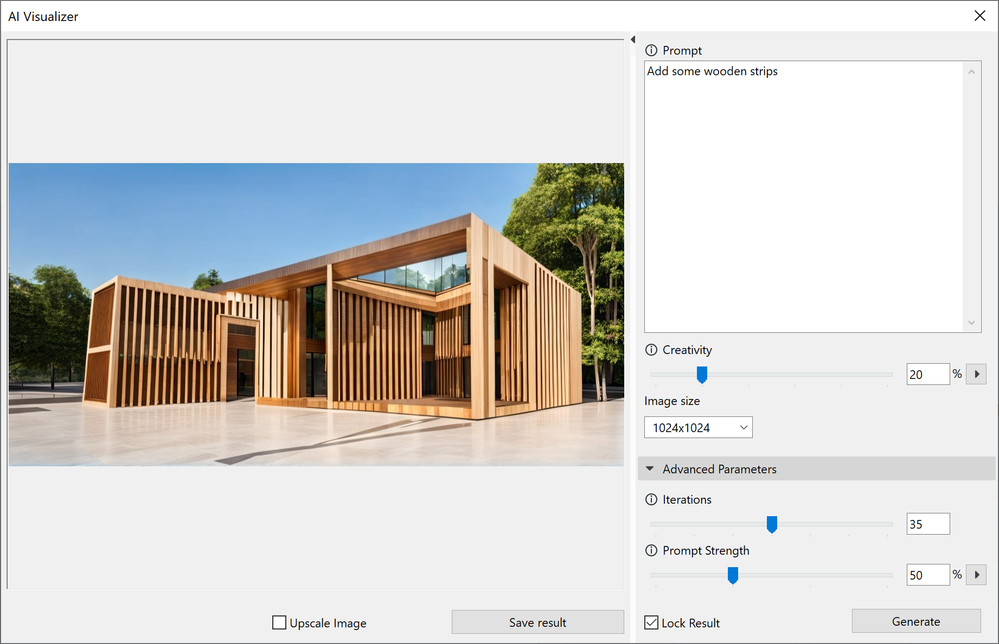As you explore various design options, the Lock Result feature becomes invaluable. This function allows you to preserve the design that resonates with your vision while continuing to experiment with other aspects. For example, if the AI generates an accurate representation of your idea, you can lock this aspect and explore different configurations for the building’s form or the integration of outdoor spaces, ensuring consistency across multiple iterations. When you have a design you like, the Lock Result feature remembers previous prompts, and you can further customize the image. Here are some examples of this feature: