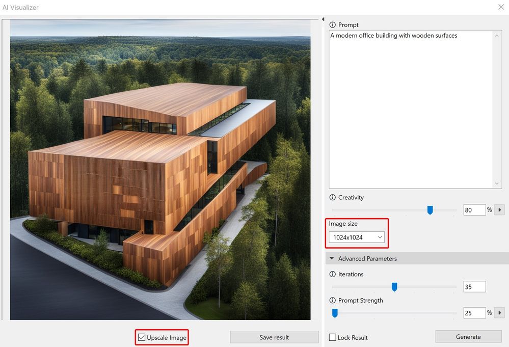 One of the standout features of the AI Visualizer is its ability to generate diverse design variations from a single mass model. By adjusting the Creativity Slider, you can control the degree to which the AI deviates from your original model. Lower settings will produce designs that closely adhere to the mass model’s geometry, while higher settings allow the AI to introduce more creative elements, such as innovative façade patterns, unique structural forms, or unexpected material combinations. For example, here we have a prompt “Create a realistic image of a modern office building with wooden surfaces and glass” and the same prompt is used with different percentages of the creativity slider: