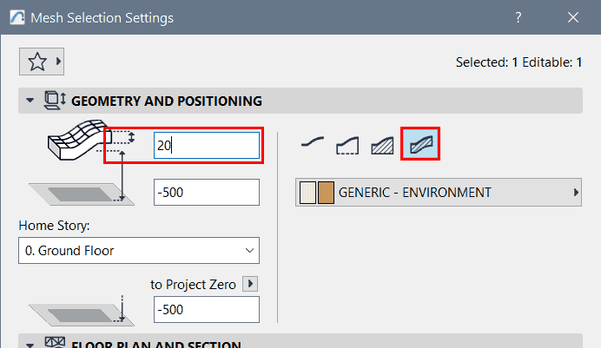 Whenever I model terrain, I dream of an additional feature that would be useful, e.g. for convenient cutting of roads, various surfaces (etc.) in the terrain mesh, so that it would then also be visible in cross-sections (e.g. by using SEO operations). This is a mesh of a given thickness: