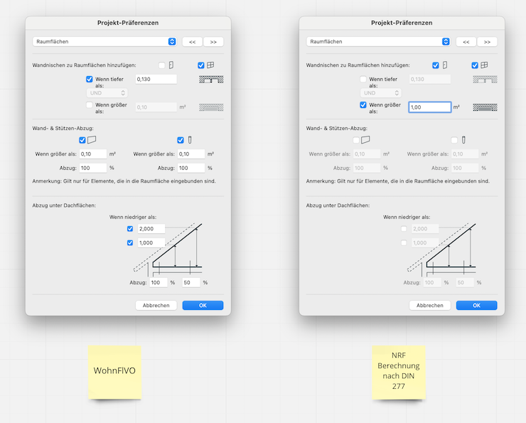 Also wenn ich das richtig verstehe, müsste die Einstellung für WohnFlVo und für NFR DIN 277 (neue Version) so aussehen.